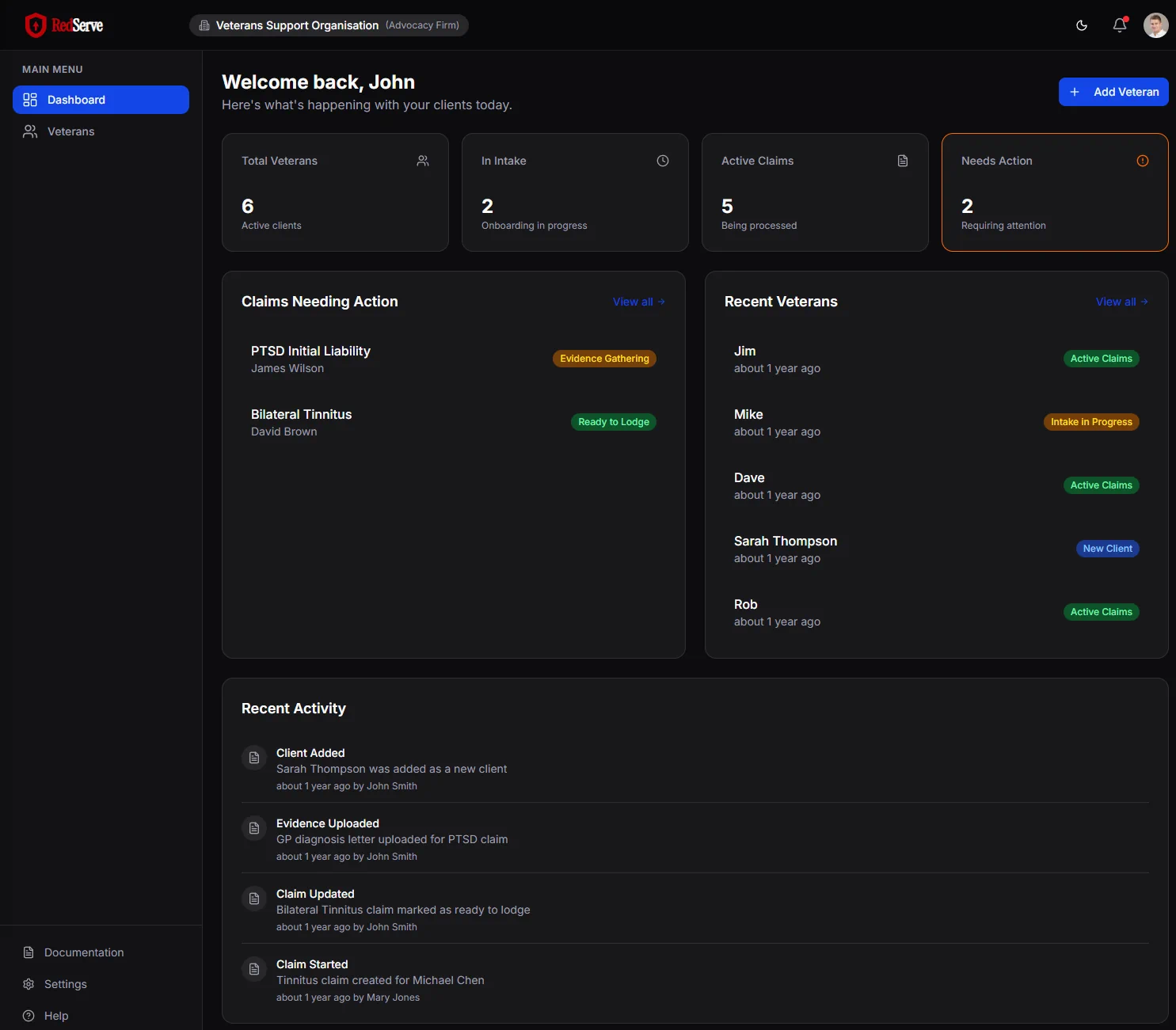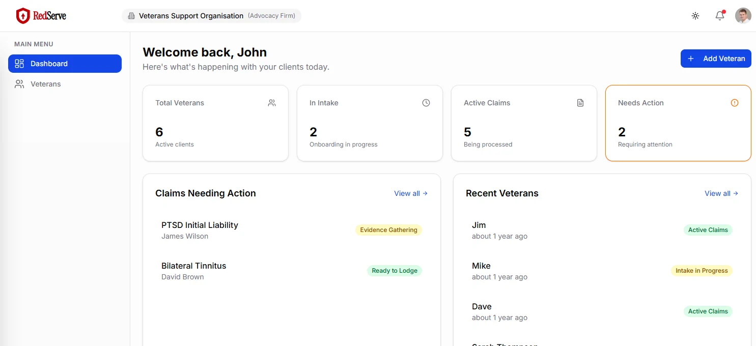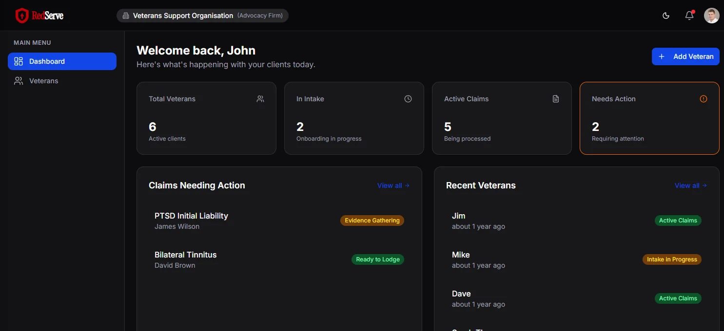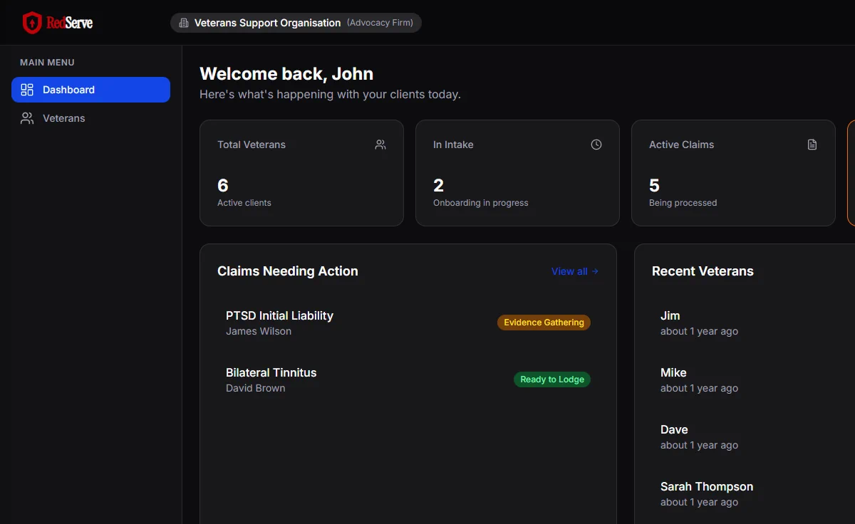 RedServe has transformed how we approach claims. What used to take days of cross-referencing SoPs and assembling evidence now happens in a structured workflow. Our veterans get better outcomes because nothing falls through the cracks.