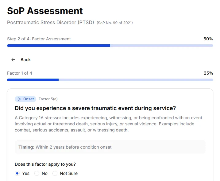 Guided interview flow captures service history, deployments, and exposure events. AI assists in uncovering claimable conditions veterans might not know they have.