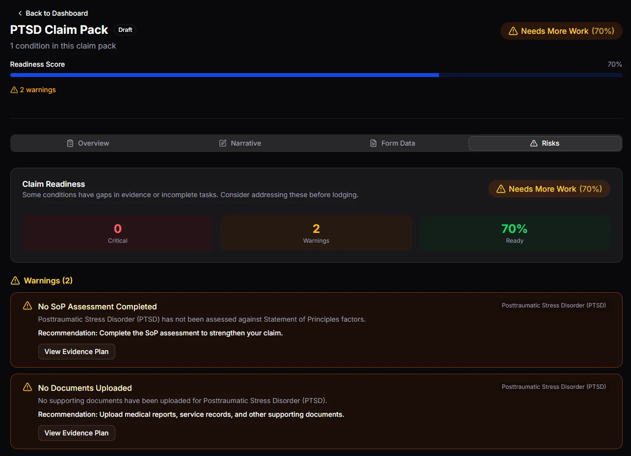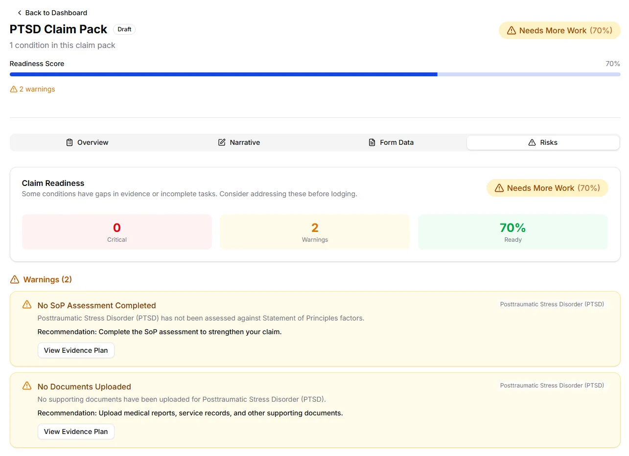 Generate complete claim packs with veteran narrative statements, evidence checklists, and form pre-fills. Everything needed to lodge through MyService — in hours, not weeks.