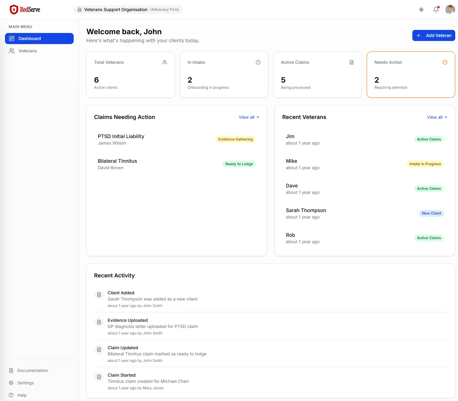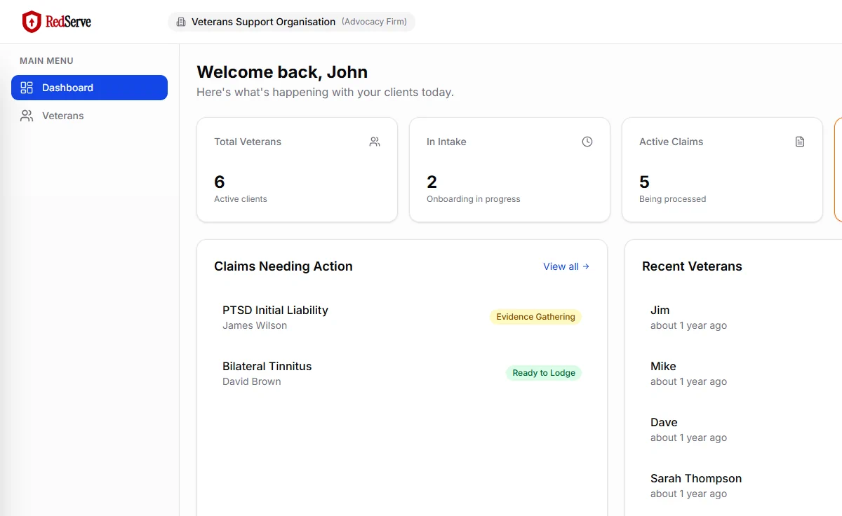 RedServe has transformed how we approach claims. What used to take days of cross-referencing SoPs and assembling evidence now happens in a structured workflow. Our veterans get better outcomes because nothing falls through the cracks.
