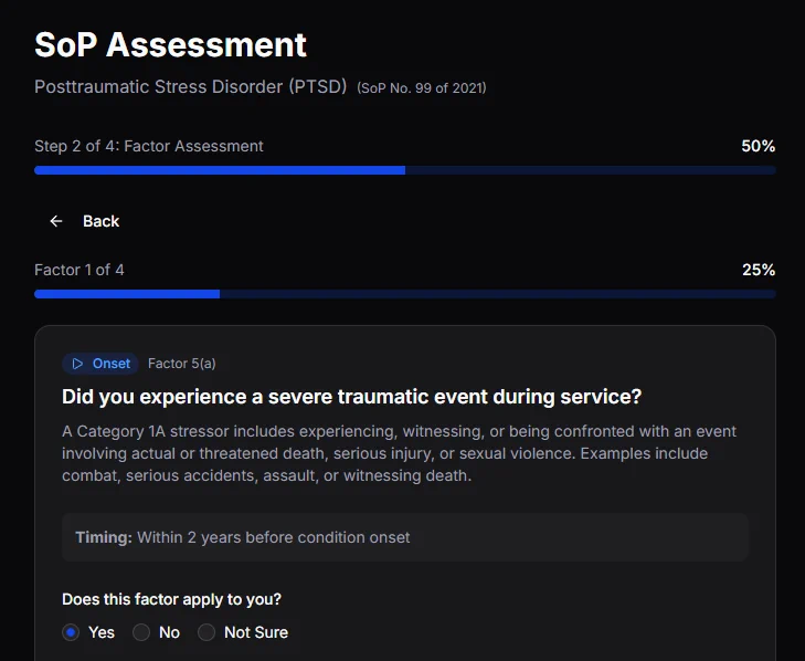 Guided interview flow captures service history, deployments, and exposure events. AI assists in uncovering claimable conditions veterans might not know they have.